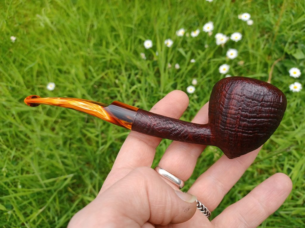 A delicious pipe with a firey-colored stem.