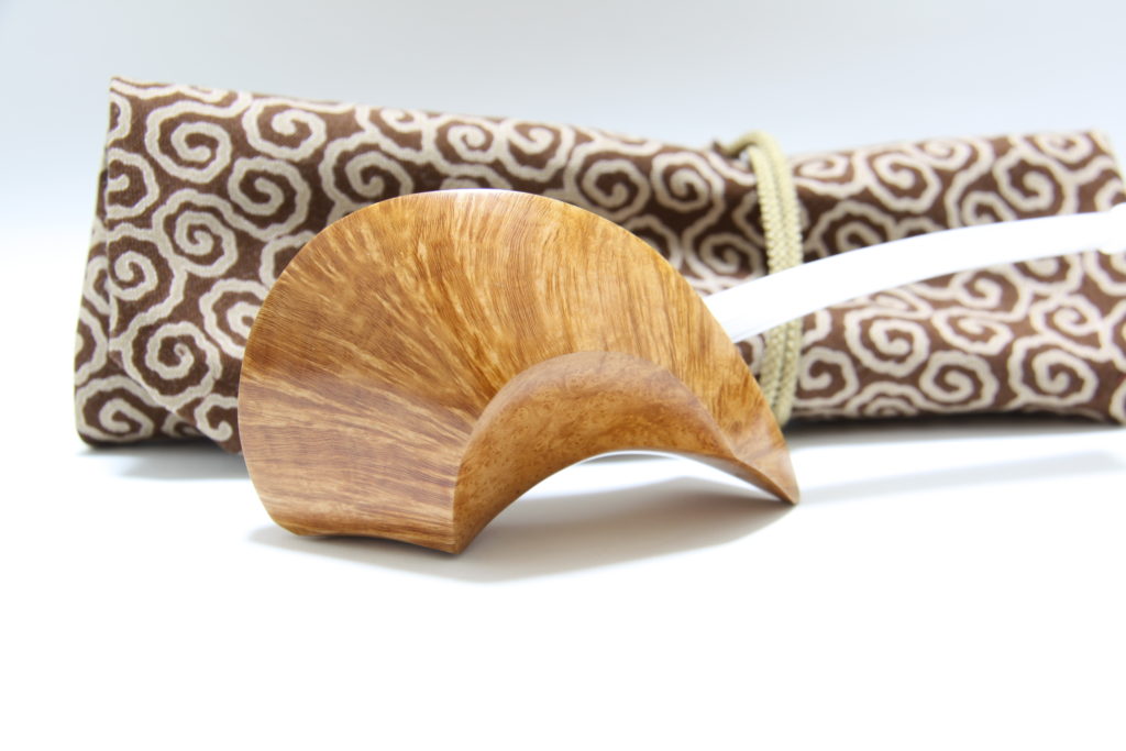Taking a page from nature, Mr Nagata`s “Dolphin” pipe is a refreshing change from the standard shapes that you`ll usually find. This unique pipe expresses a flowing sense of movement. The long angular shape displays the pipe`s beautiful grain and in contrast to the wood Mr Nagata has added a pretty white stem. The pipe is also complemented with a brass capped cow horn tamper.