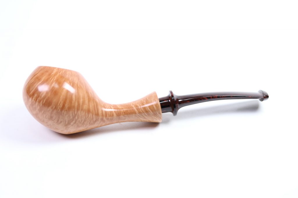 Mr. Kosaka has used a natural stain to show off the pipe’s flawless grain. A crimson Cumberland stem gives a nice symmetric contrast to the pipe’s fair complexion.